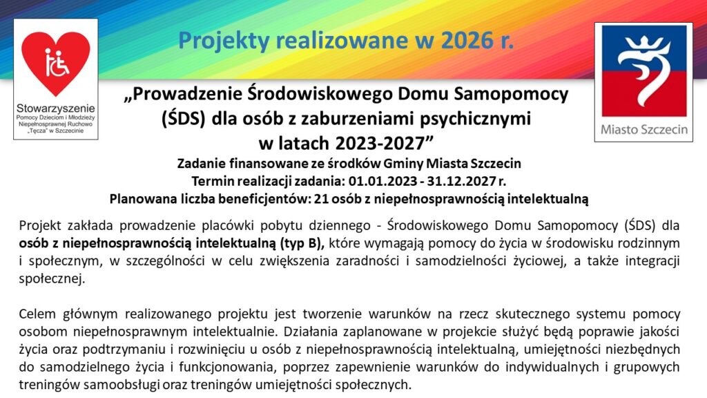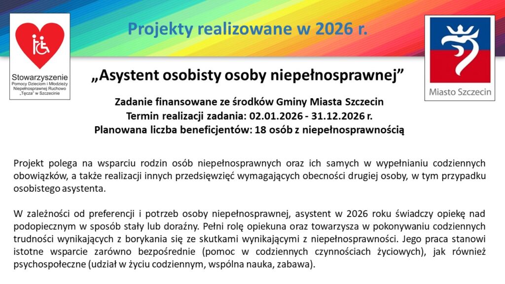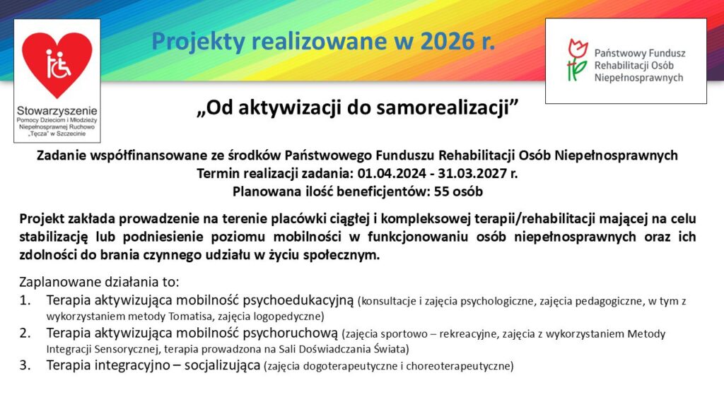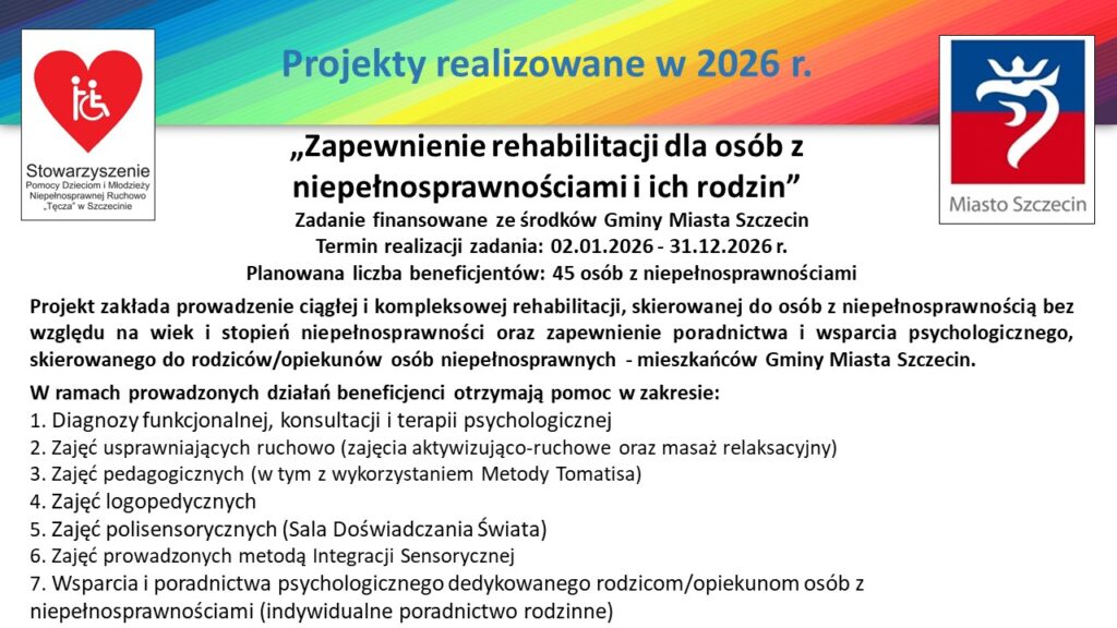 Stowarzyszenie Pomocy Dzieciom i Młodzieży Niepełnosprawnej Ruchowo „Tęcza” kontynuując swoją misję, jaką jest prowadzenie terapii i rehabilitacji dla dzieci, młodzieży, a także dorosłych osób niepełnosprawnych, również w 2026 r. realizuje szereg projektów finansowanych/współfinansowanych m.in. ze środków Gminy Miasta Szczecin oraz Państwowego Funduszu Rehabilitacji Osób Niepełnosprawnych.